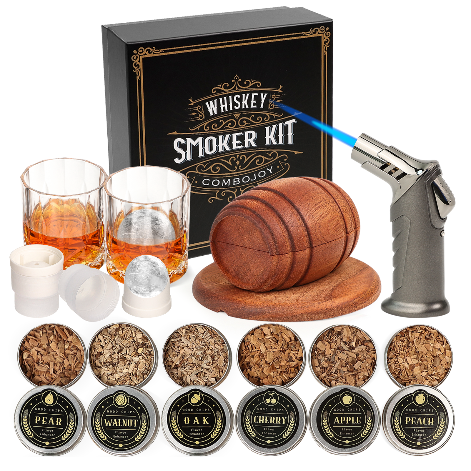 Whiskey Smoker Kit with Torch - 6 Flavors Wood Chips, 2 Glasses, 2 Ice Ball Molds - Birthday Cocktail Gifts for Men (NO Butane)