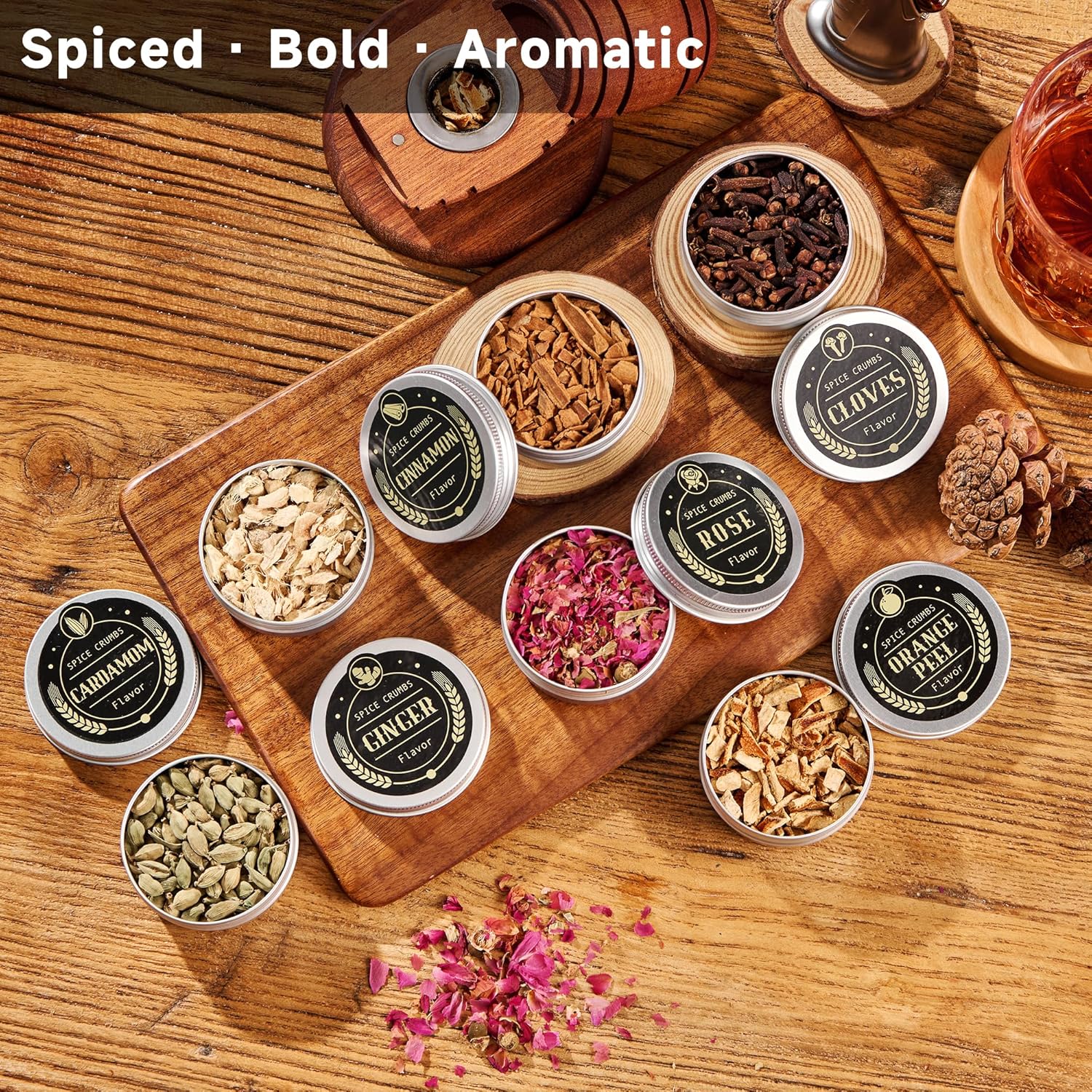 - 12 PREMIUM FLAVORS – WOOD & SPICE BLEND: Enjoy a unique fusion of 6 pure wood chips (Pear, Peach, Cherry, Apple, Oak, Walnut) and 6 aromatic spices (Cinnamon, Cloves, Orange Peel, Cardamom, Rose, Ginger). Crafted to create rich, complex smoky layers in whiskey, cocktails, and gourmet dishes.